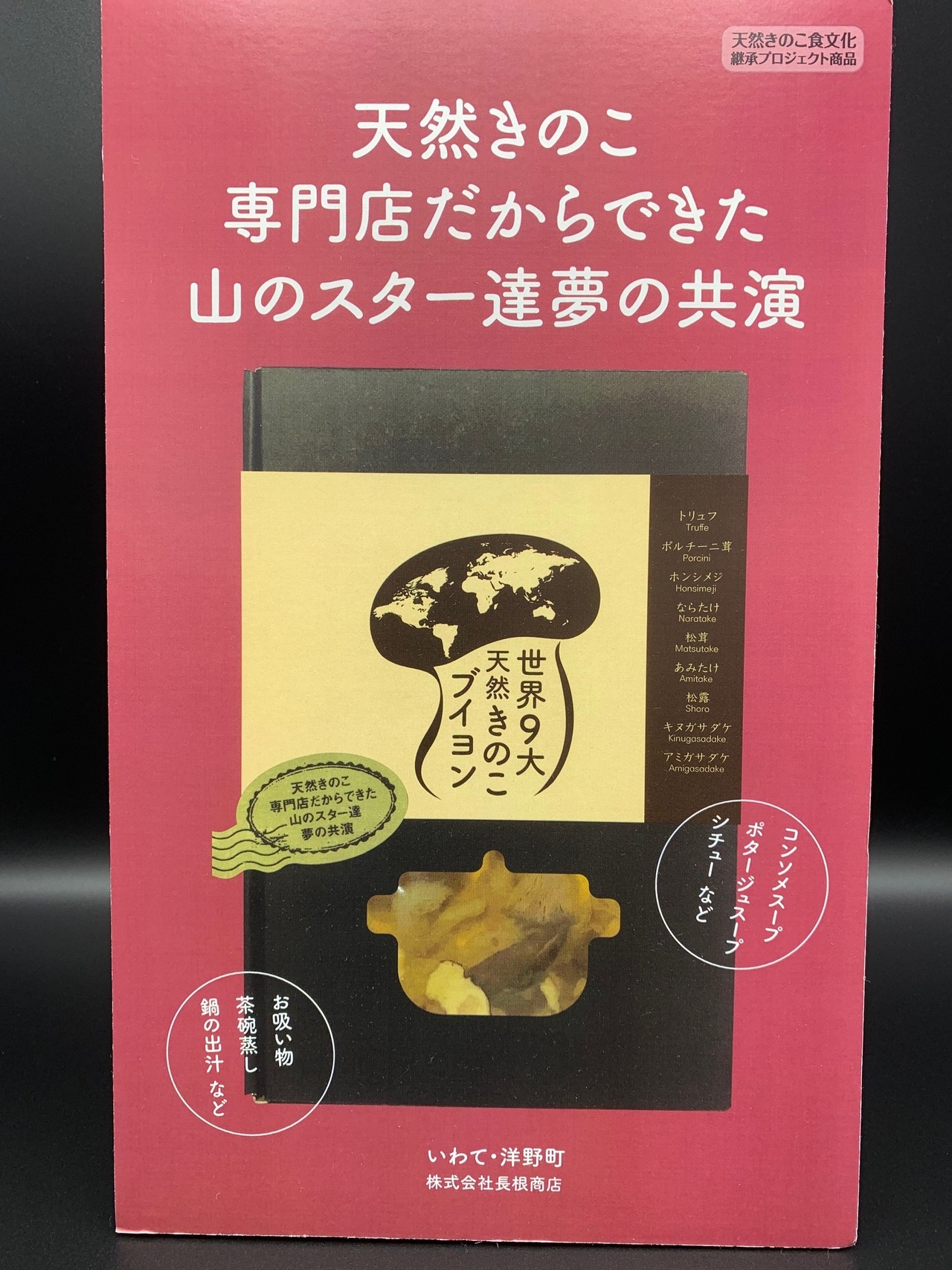 トリュフ、ポルチーニ、ならたけ、キヌガサタケ、あみたけ、ホンシメジ、松露、アミガサタケ、松茸の9種類のきのこを、少しの天然海水塩だけでじっくり煮出して、濃厚な出汁を抽出しました。